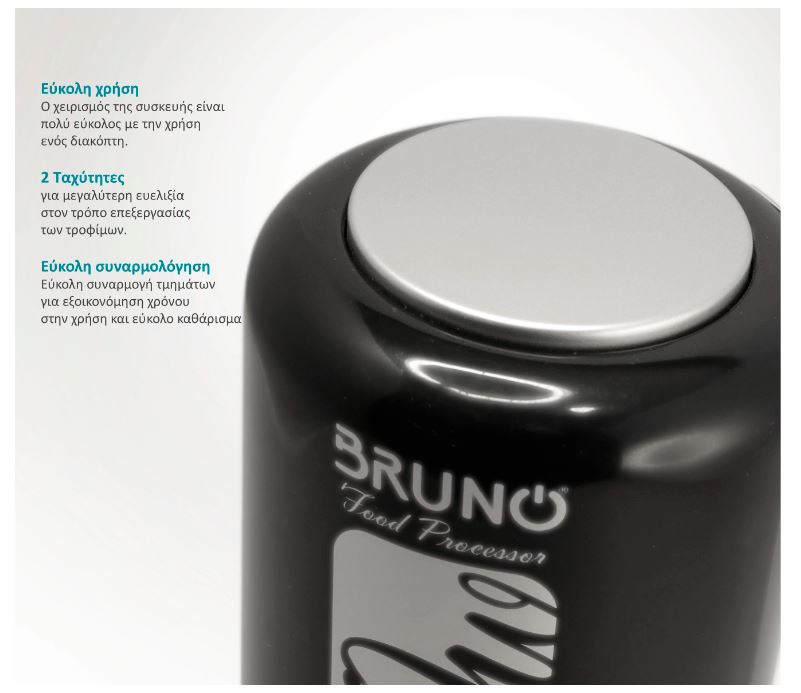 Ο πολυκόπτης της Bruno ψιλοκόβει υλικά όπως λαχανικά ή μυρωδικά, αναμειγνύει σάλτσες, κρέμες κ.α, και αλέθει ξηρούς καρπούς, μπισκότα, παιδικές τροφές κ.α. Εξοπλίζεται με ισχυρό μοτέρ 400W και 4 αιχμηρές λεπίδες από ανοξείδωτο ατσάλι υψηλής αντοχής.