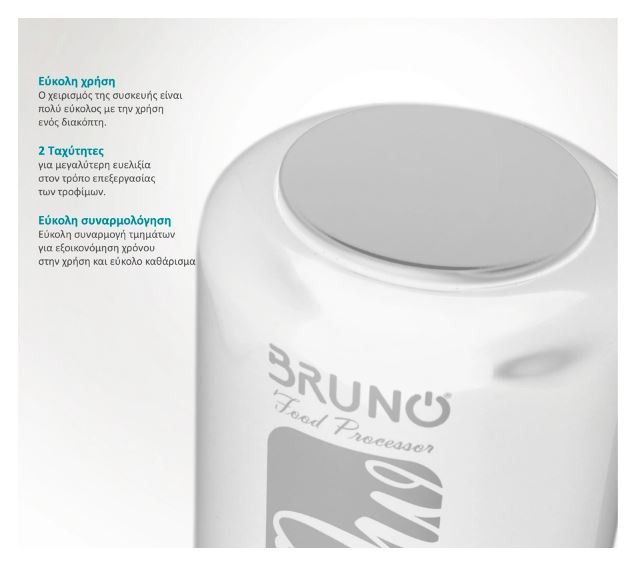 Ο πολυκόπτης της Bruno ψιλοκόβει υλικά όπως λαχανικά ή μυρωδικά, αναμειγνύει σάλτσες, κρέμες κ.α, και αλέθει ξηρούς καρπούς, μπισκότα, παιδικές τροφές κ.α. Εξοπλίζεται με ισχυρό μοτέρ 400W και 4 αιχμηρές λεπίδες από ανοξείδωτο ατσάλι υψηλής αντοχής.