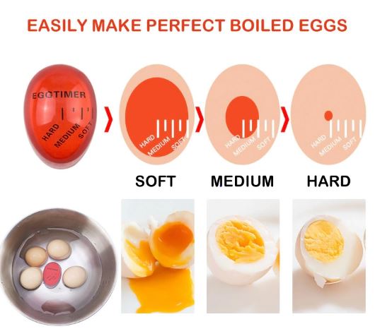 Χρονόμετρο ιδανικό για το βράσιμο των αυγών. Τοποθετώντας το χρονόμετρο στο νερό μαζί με τα αυγά που βράζουν, μέσω της θερμότητας του νερού, μεταβάλλεται το κόκκινο χρώμα του, δείχνοντας σας με αυτόν τον τρόπο το επίπεδο σκληρότητας των αυγών. Διαθέτει 3 δείκτες σκληρότητας (hard, medium, soft).